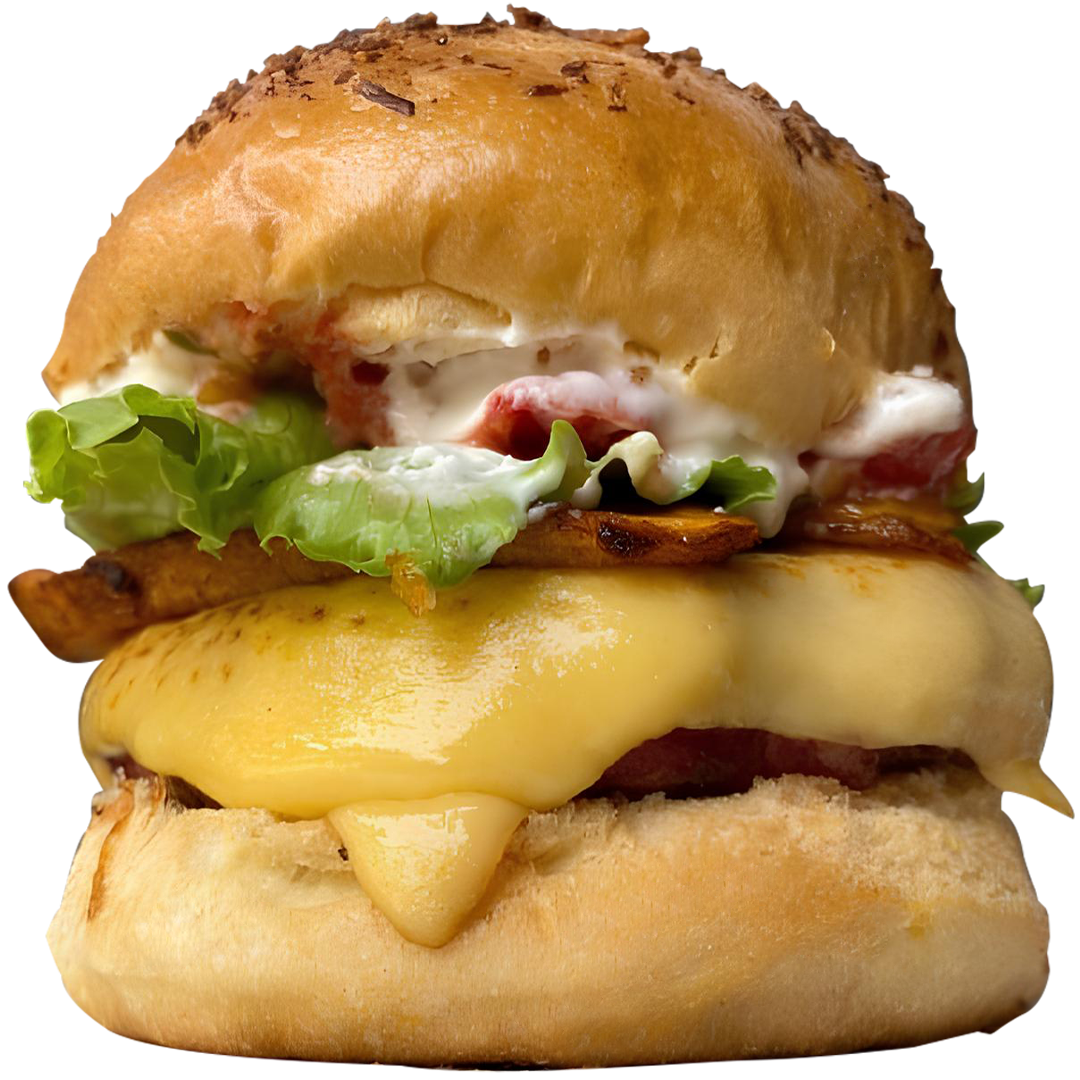 Pão Brioche especial, 150g de Hambúrguer Bovino Defumado, Queijo prato em fatia, Banana da Terra frita, Alface crocante, Tomatinhos temperados e Muuuita Maionese Defumada da casa.