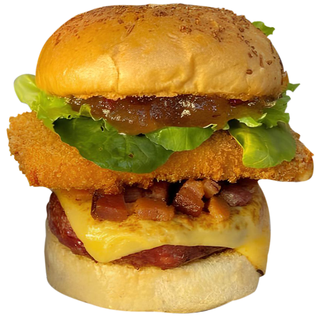 Pão Brioche especial, 150g de Hambúrguer Bovino Defumado, Queijo prato em fatia, Bacon de alta qualidade em cubos, 90g do nosso FAMOSO Queijo Prato empanado, Geleia de Abacaxi Defumado com pimenta artesanal, Alface crocante e Rúcula fresca.