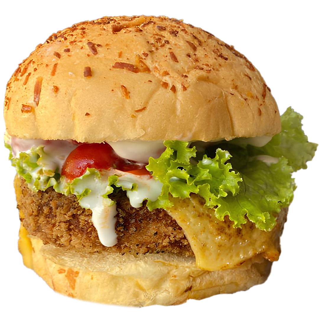 Pão Brioche especial, 150g de Hambúrguer de Frango Defumado e Empanado, Queijo Prato em fatia, Tomatinho Cereja Temperado, Rúcula fresca, Alface crocante e maionese defumada da casa.
