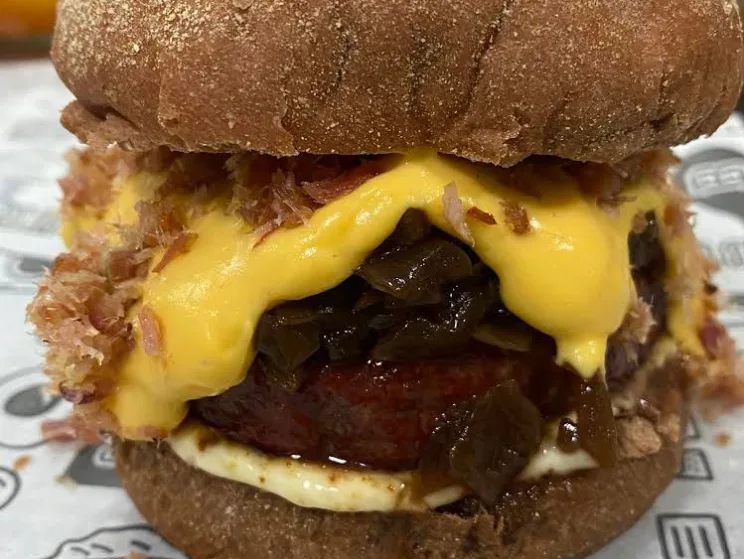 Pão Australiano, 150g de Hamburguer Bovino Defumado, Cebola roxa caramelizada artesanalmente, Nosso inconfundível American Cheese (Molho de Queijo) Farofa de Bacon e Maionese Defumada da casa.