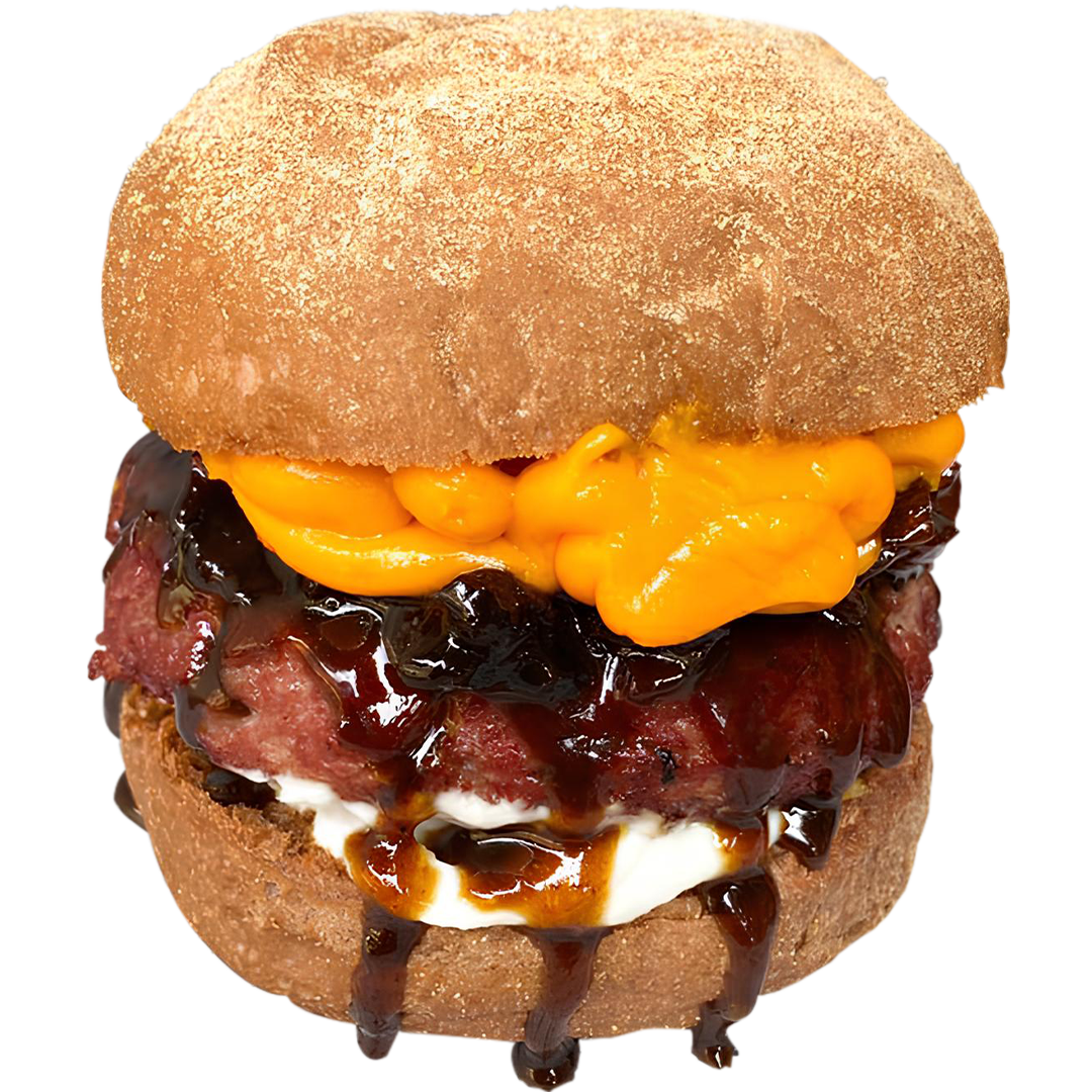 Pão Australiano, 150g de Hambúrguer Bovino Defumado, Geleia de Bacon artesanal (agridoce), Creme de Cheddar e nossa Maionese Defumada da casa.